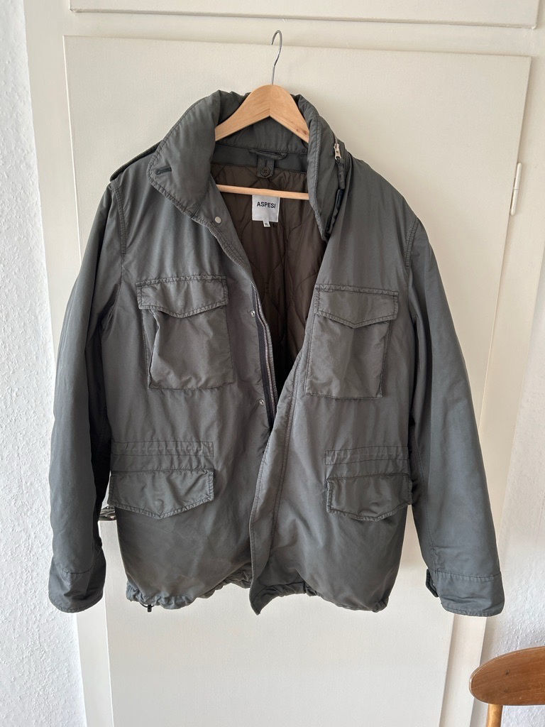 Aspesi Nylon jacket with removable insulation. Water repellent. Hood is stowed away in the collar